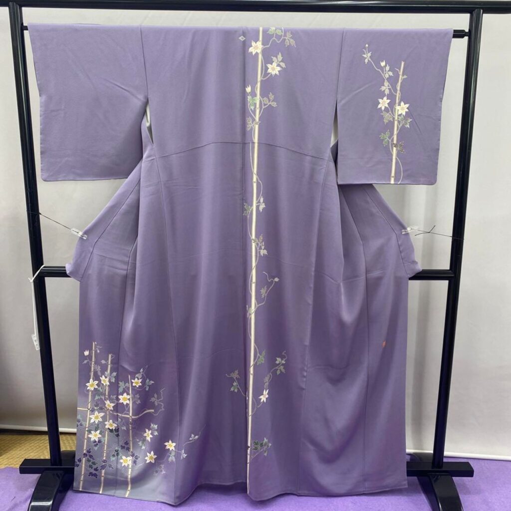 5840 紫 鉄扇 訪問着 着物 正絹 紋有り 落款有り 買取しました