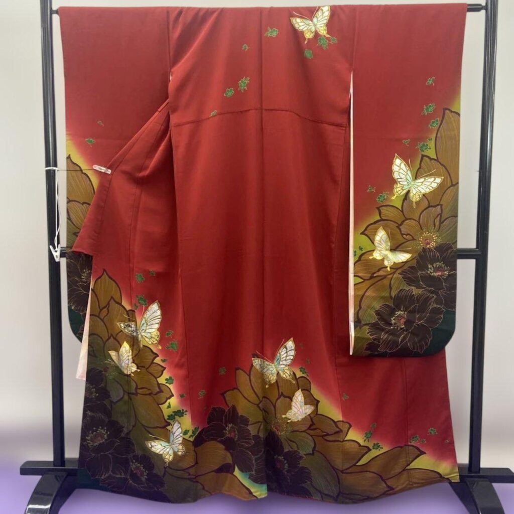 6178 臙脂色 振袖 着物 正絹 襦袢付き 蝶 着付け練習用 買取しました!